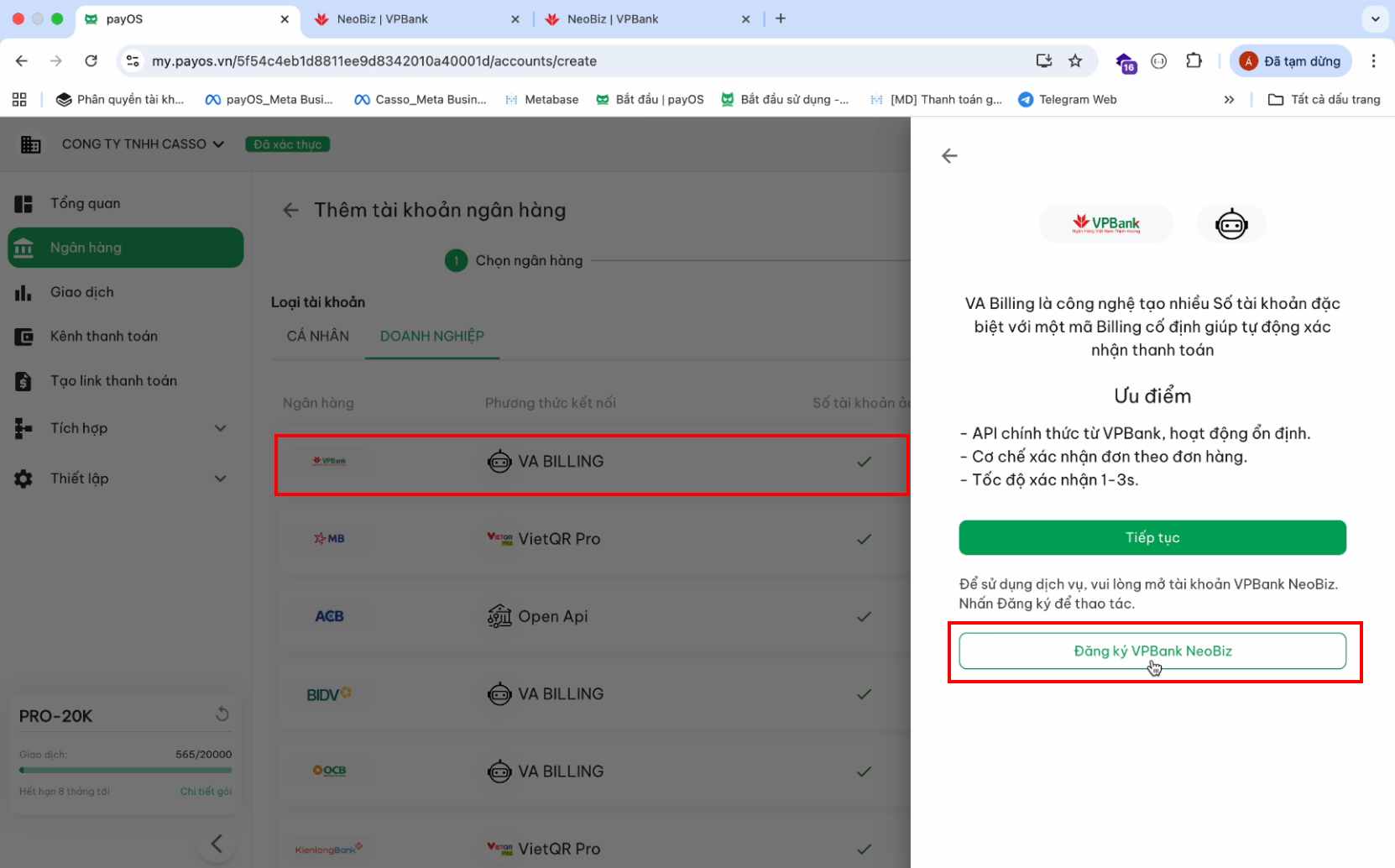 Hướng dẫn tích hợp VPBank NEOBiz trên payOS: Tại đây