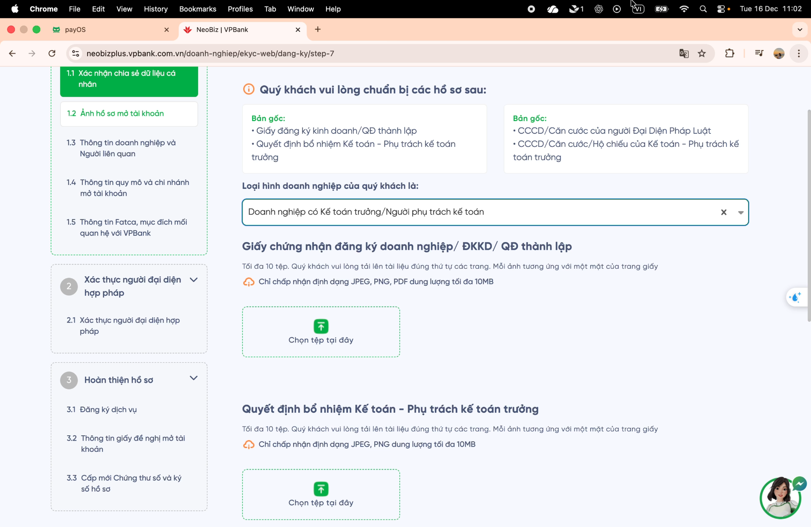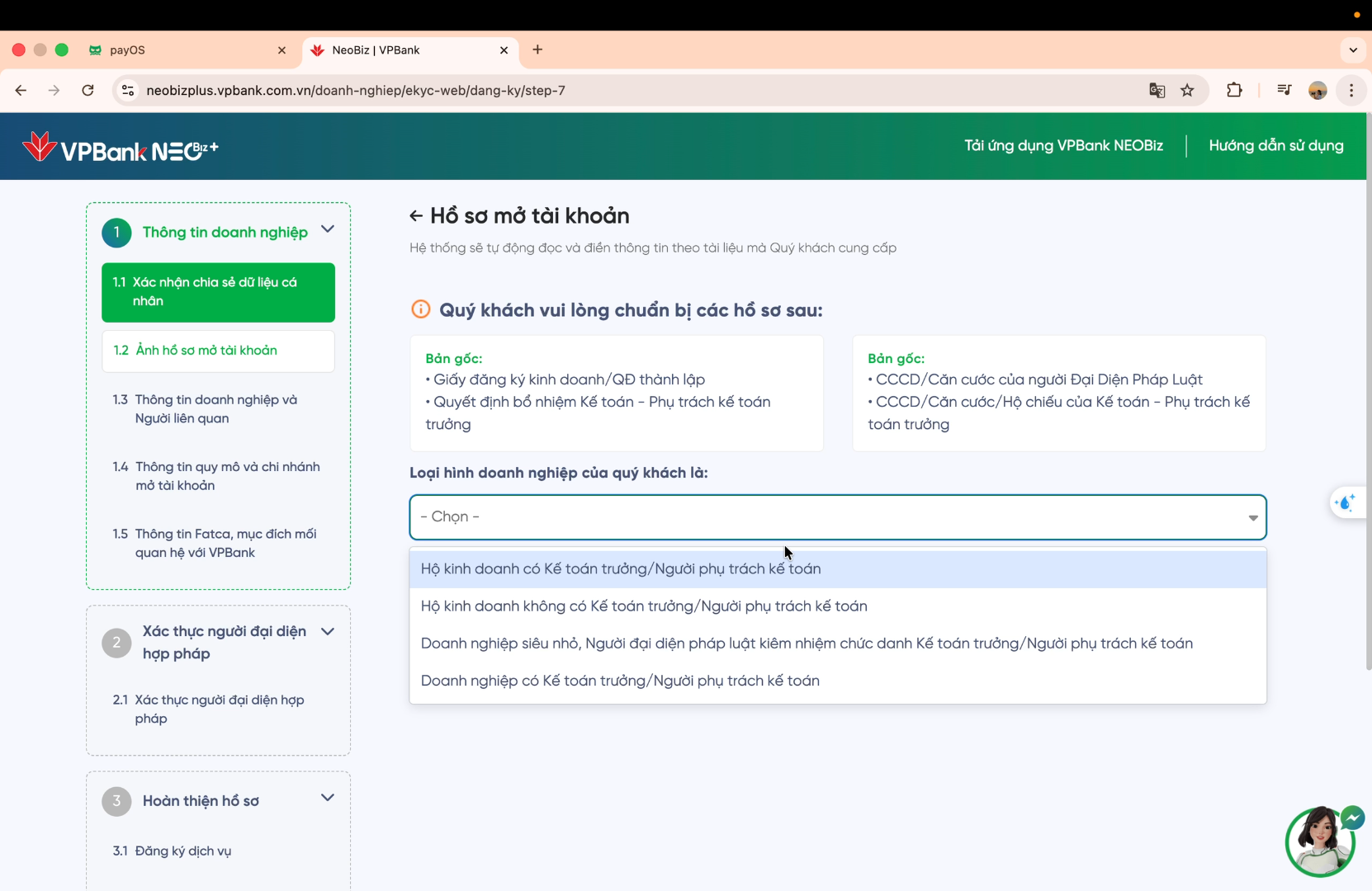 Sau khi chọn đúng loại hình doanh nghiệp, bạn tiếp tục tải lên các tài liệu và điền thông tin hồ sơ theo hướng dẫn của VPBank cho đến khi hoàn tất đăng ký.